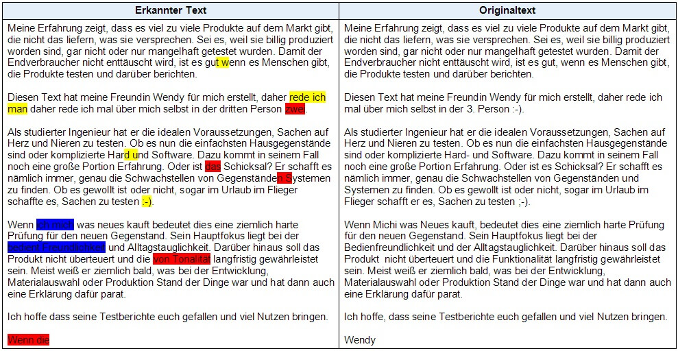 Dazu vergleiche ich den Originaltext mit dem erkannten Text und markiere die Fehler: